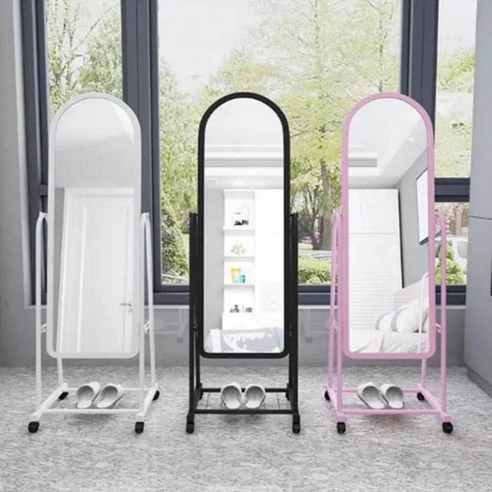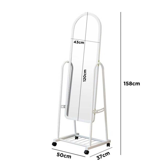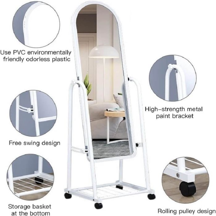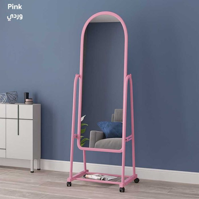 مرآة قائمة بذاتها بطول كامل مزودة بعجلات ورف تخزين