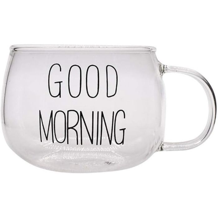 - مصنوع من الزجاج الشفاف مع عبارة "صباح الخير" مطبوعة بأحرف سوداء