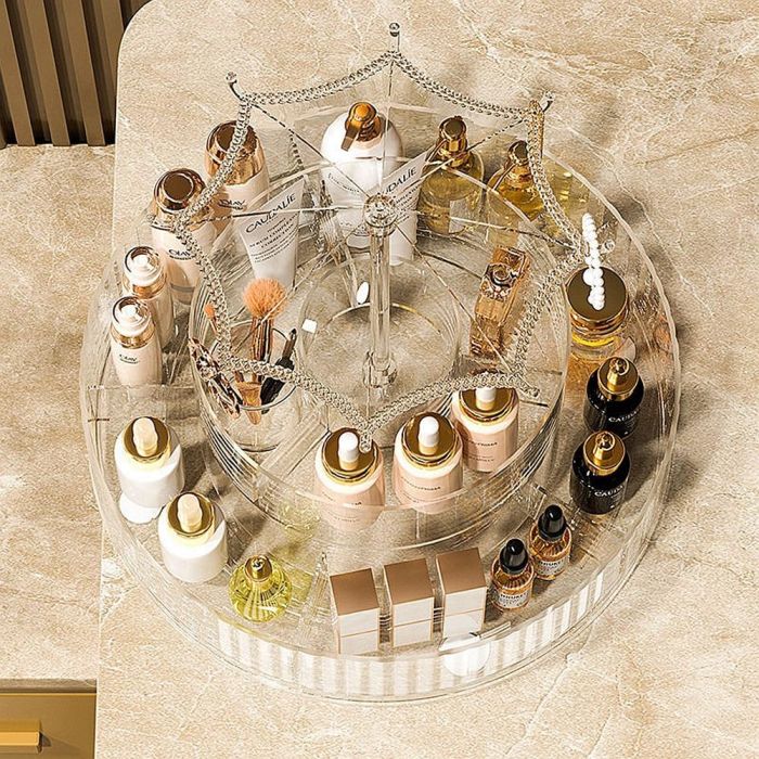منظم التخزين الأنيق والعملي هذا مثالي لترتيب مستلزمات التجميل الأساسية. مصنوع من الأكريليك الشفاف، ويتميز بتصميم دوار 360 درجة لسهولة الوصول إلى جميع الكريمات والعطور ومستحضرات التجميل. يضفي تصميمه الشفاف الأنيق لمسة جمالية على أي غرفة، من الحمام إلى غرفة النوم.