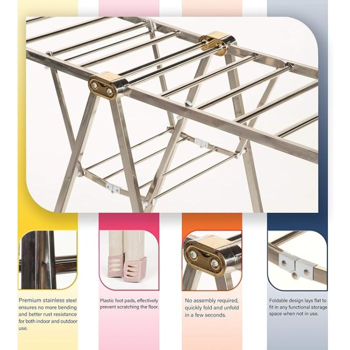 Foldable metal clothes dryer offers a practical, space-saving solution for efficient drying. Made from durable, rust-resistant metal, it is lightweight and easy to move. Its foldable design ensures easy storage without taking up much space and suits both indoor and outdoor use. Enjoy organized and quick drying with this modern, functional dryer.