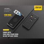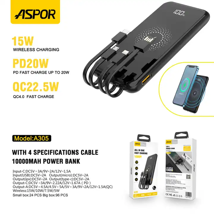 باور بانك من اسبور A305 بسعة 10000 مللي أمبير في الساعة يدعم 3 طرق لشحن الهواتف المحمولة شحن سريع لاسلكي 15 وات